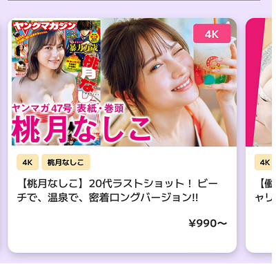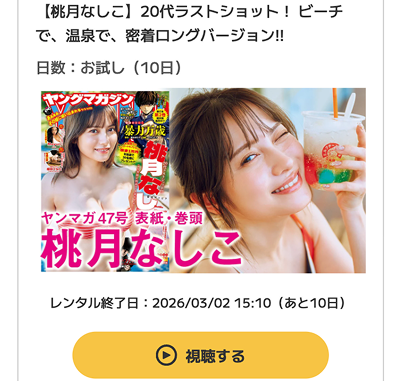 『週刊ヤングマガジン』のグラビア企画と連動した新着動画が、サブスク会員は通常価格より20%OFFでレンタル可能!(例:10日レンタルで110円引き、100日レンタルで1100円引き)割引本数に制限はありません。